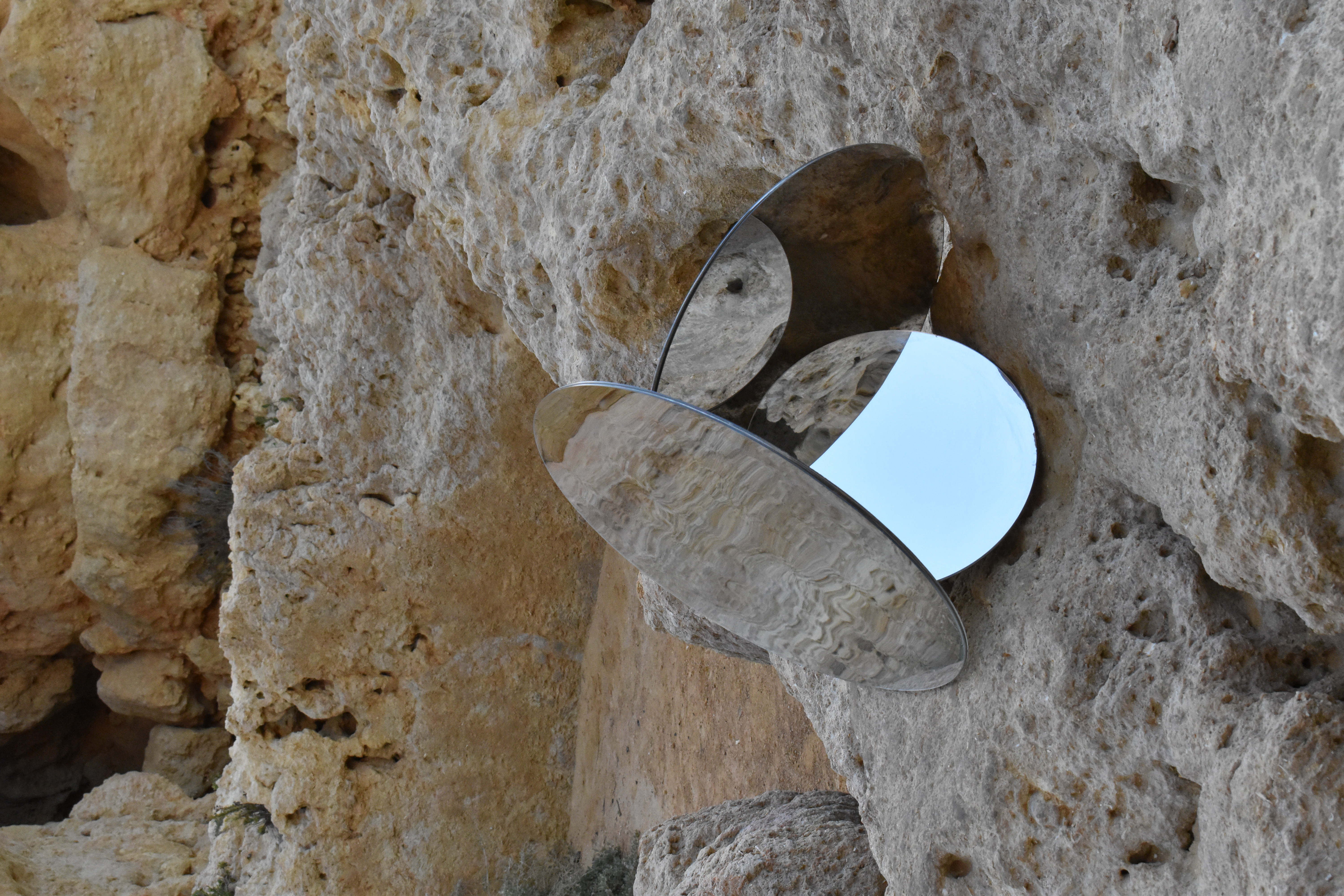 The elliptical mirrored sculpture explores a sense of visual transformation in its own material and three-dimensional shape in relation to its surroundings. Changing circumstances of natural and artificial light provokes unique visual effects of the sculpture emphasizing the notion of time in space. The changing light reflections enable a deeper relationship between human perception and materiality through which the sculpture becomes an object of contemplation.