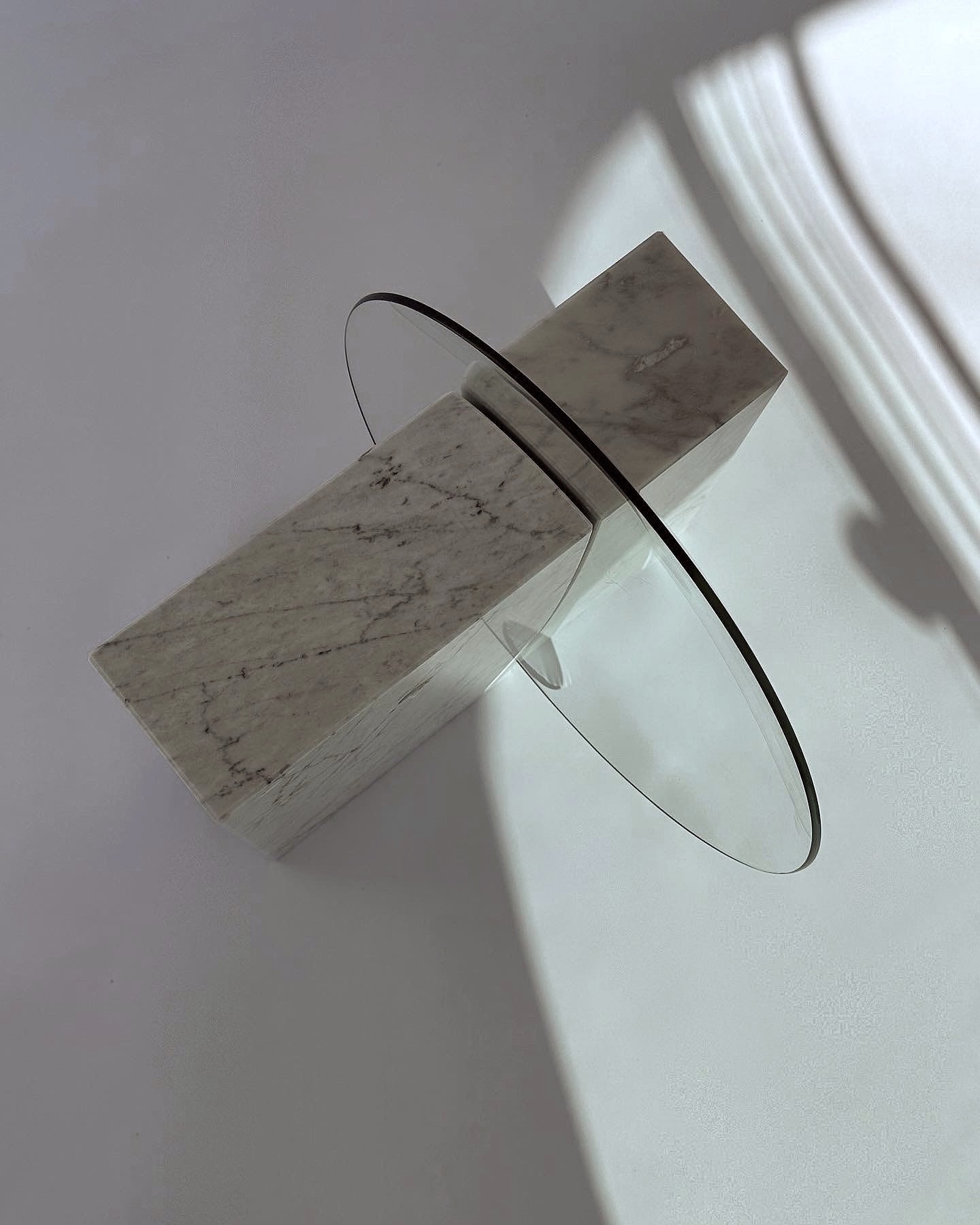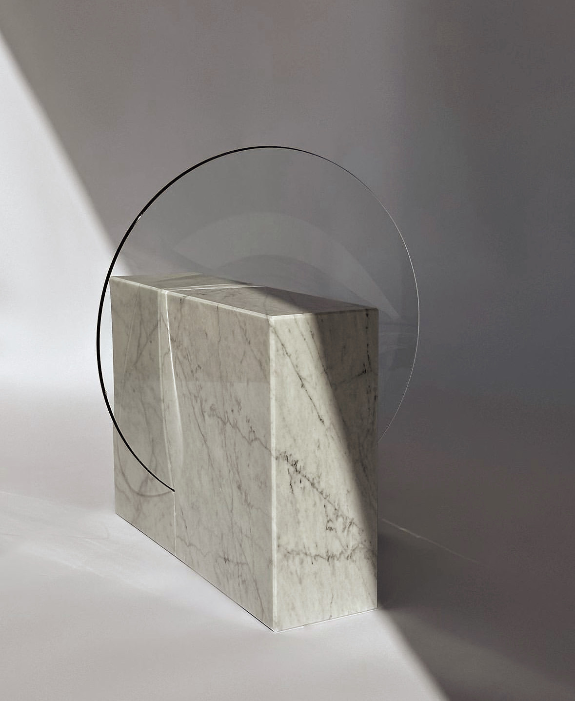 Inspired by the geometric and minimal shapes of brutalist architecture, “Recurrence” is a sculpture composed by a marble cuboid and a clear concave glass lens. The brutalist concept was re-interpreted with different materials beyond the typical concrete character. The volumetric glass fused with a concave cut into the Carrara marble enables a more complex relationship between the shapes and materials. Through the changing light circumstances that surround the object, natural reflections produced by the glass can be rediscovered in the patterns of the marble.